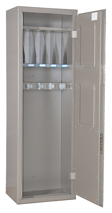 Сейф Меткон ОШ-5АКМ предназначен для хранения оружия, патронов и принадлежностей. Модель оснащена отверстиями для крепления на задней стенке корпуса, полкой 5 отделениями под подсумки, 2 ключевыми замками и 2 рамками под опись на внутренней стороне двери. Ложементы выполнены из металла с резиновыми роликами. Дополнительные характеристики: