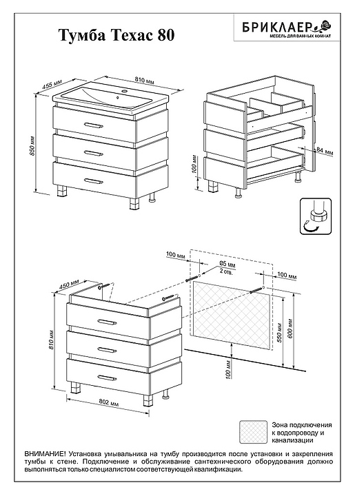 Тумба БРИКЛАЕР Техас 80 выполнена в современном эко-стиле. Благодаря простоте и функциональности мебель станет украшением любой ванной комнаты. Модель оснащена 3 вместительными выдвижными ящиками для хранения ванных принадлежностей. Корпус и фасад мебели выполнены из влагостойкой ЛДСП, ручки и ножки - из хромированного металла. Может использоваться в комплекте с раковиной Фостер 80, Комо 80 и Mario 80. В комплект поставки входят 3 пластиковые ручки и 3 пластиковые опоры (декоративные спереди и поддерживающие сзади). Особенности: