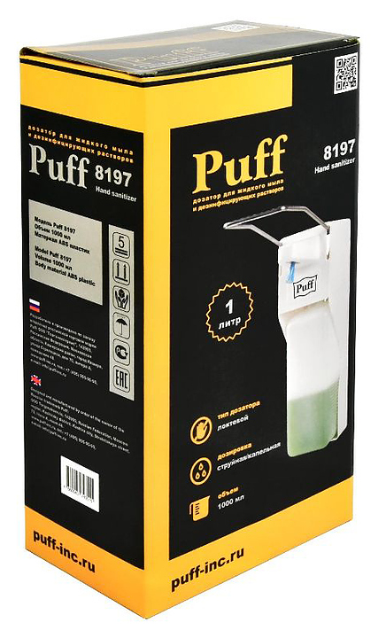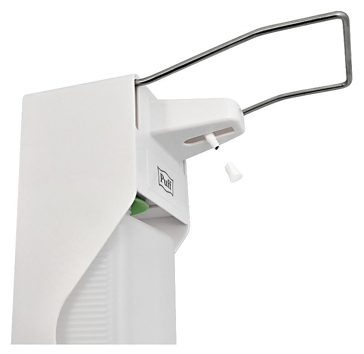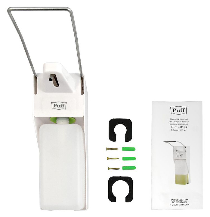 Локтевой дозатор Puff 8197 предназначен для размещения и дозированной подачи жидких и гелеобразных антисептических растворов и жидкого мыла в санитарных узлах офисов, гостиниц, предприятий общественного питания, медицинских учреждений и других мест средней проходимости. Модель оснащена удобной ручкой. Корпус выполнен из белого ударопрочного АБС-пластика, ручка - из металла. В комплект поставки входит набор крепежа. Особенности: