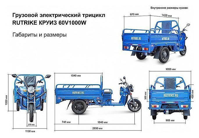 Грузовой электроцикл Rutrike Круиз 60V/1000W используется для работы на складах, промышленных предприятиях, для обслуживания больших территорий, отелей, эко-парков и природных зон. Модель оснащена кузовом, имеющим подъёмную конструкцию на газовых амортизаторах. Аккумуляторные батареи в комплект поставки не входят и приобретаются отдельно. Внимание! Данная конструкция не предусмотрена для фиксации кузова в поднятом положении, а лишь для облегчения его подъёма! Особенности: