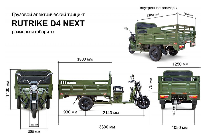 Грузовой электроцикл Rutrike D4 NEXT 1800 60V1200W используется для работы на складах, промышленных предприятиях, для обслуживания больших территорий, отелей, эко-парков и природных зон. Модель оснащена полностью герметичным тяговым бесщеточным двигателем, c силовыми шестернями редуктора, который имеет свободный дифференциал и установлен в неразрезной мост с усиленными полуосями. Аккумуляторные батареи в комплект поставки не входят и приобретаются отдельно. Внимание! Данная конструкция не предусмотрена для фиксации кузова в поднятом положении, а лишь для облегчения его подъёма! Особенности: