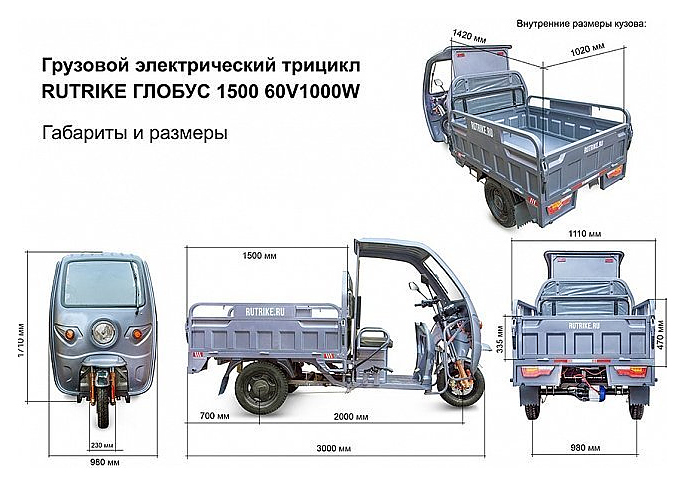 Грузовой электроцикл Rutrike Глобус 1500 60V/1000W используется в отельных и гостиничных комплексах, для доставки документов, товаров и продуктов питания. Модель оснащена металлической кабиной и тяговым бесщеточным двигателем нового поколения, который выдает на 30% больше крутящего момента. Аккумуляторные батареи в комплект поставки не входят и приобретаются отдельно. Внимание! Данная конструкция не предусмотрена для фиксации кузова в поднятом положении, а лишь для облегчения его подъёма! Особенности: