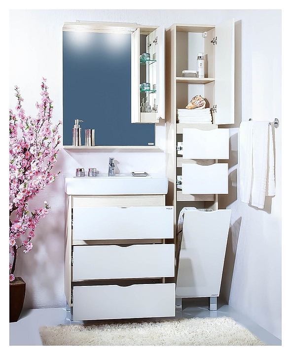 Зеркало БРИКЛАЕР Токио 60 выполнено в стиле японского минимализма и отлично дополнит интерьер любой ванной комнаты. Благодаря подвесной конструкции модель не занимает много места, что позволяет экономить пространство в небольшой ванной комнате. Модель оснащена козырьком с 2 врезными галогеновыми светильниками, а также небольшим закрытым шкафчиком с распашной дверцей и 2 стеклянными полочками внутри для хранения ванных принадлежностей. Корпус выполнен из ламинированной влагостойкой ДСП, фасад - из МДФ. Зеркальное полотно покрыто серебром с амальгамой, благодаря чему в период эксплуатации зеркало не деформируется, а отражение не искажается. В комплект поставки входят навески для крепления к стене, 2 галогеновых светильника со сменными лампами 12 V, выключатель с розеткой, электрический провод 0.5 м для подключения к электросети 220 В и петли с доводчиками. Особенности: