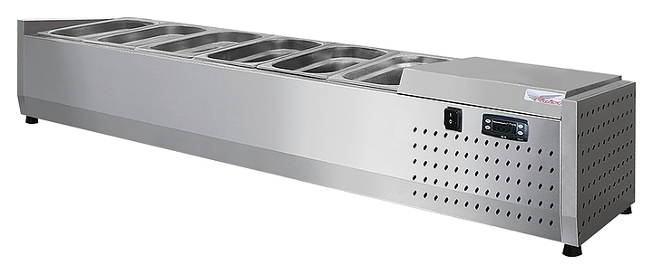 Настольная холодильная витрина Finist ToppingBox НХВо-6 предназначена для демонстрации и кратковременного хранения подготовленных начинок и топпингов для пиццы, блинов, лапши WOK, а также мясных изделий и полуфабрикатов на предприятиях общественного питания и торговли. Модель оснащена открытой камерой для размещения гастроемкостей, устойчивыми ножками, кабелем питания с вилкой и кнопочной панелью управления с цифровым дисплеем. Цельнозаливной корпус выполнен из высококачественной нержавеющей стали. Гастроемкости в комплект поставки не входят. Особенности: