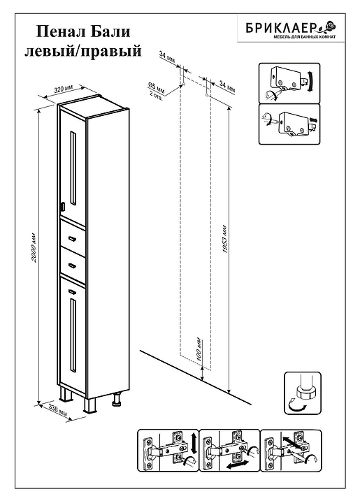 Шкаф-пенал БРИКЛАЕР Бали 34 выполнен в стиле модерн и отлично дополнит интерьер любой ванной комнаты. Модель оснащена 2 секциями с распашными дверцами и разделительными полками для хранения ванных принадлежностей, 2 выдвижными ящиками и съемной бельевой корзиной. Напольная конструкция обеспечивает легкий монтаж и не требует специального ремонта в помещении. Корпус изделия выполнен из влагостойкой ЛДСП, отличающейся влагостойкостью, прочностью, устойчивостью к перепадам температурных режимов, способностью сохранять цвет и форму изделия в первозданном виде длительный срок, фасад - из МДФ, фурнитура - из металла с тонким защитным слоем, устойчивым к механическим повреждениям. В комплект поставки входят бельевая корзина, подвесы для крепления к стене, направляющие с доводчиками, петли с доводчиками, 4 пластиковые опоры и 4 металлические ручки. Особенности: