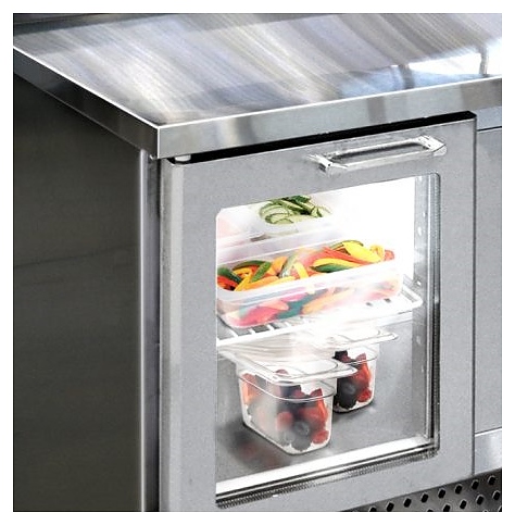 Холодильный стол Finist СХСпцг-700-3 предназначен для хранения скоро портящихся полуфабрикатов из мяса, рыбы и других ингридиентов для приготовления пиццы на предприятиях общественного питания и торговли. Модель оснащена расположенным сбоку агрегатным отсеком, столешницей с отсеком для гастроемкостей с крышкой, 3 холодильными камерами с распашными дверцами, устойчивыми ножками с подпятниками, кабелем питания с евровилкой и кнопочной панелью управления с цифровым дисплеем. Корпус выполнен из высококачественной нержавеющей стали, столешница – из гранита. Особенности: