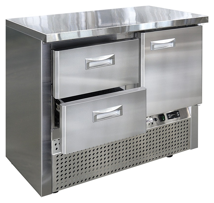 Холодильный стол Finist СХСн-600-1/2 предназначен для хранения предварительно охлажденных мясных и рыбных полуфабрикатов, заготовок для салатов, молочной продукции, охлажденных напитков и других пищевых продуктов на предприятиях общественного питания и торговли. Модель оснащена расположенным снизу агрегатным отсеком, столешницей с задним бортом, холодильной камерой с распашной дверцей, 2 выдвижными ящиками, устойчивыми ножками с подпятниками, кабелем питания с евровилкой и кнопочной панелью управления с цифровым дисплеем. Корпус выполнен из высококачественной нержавеющей стали. Особенности: