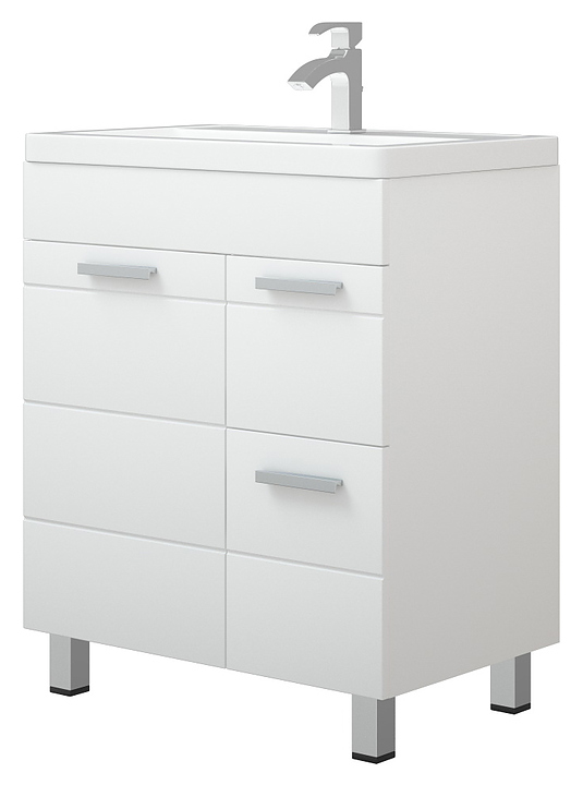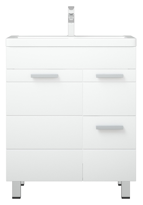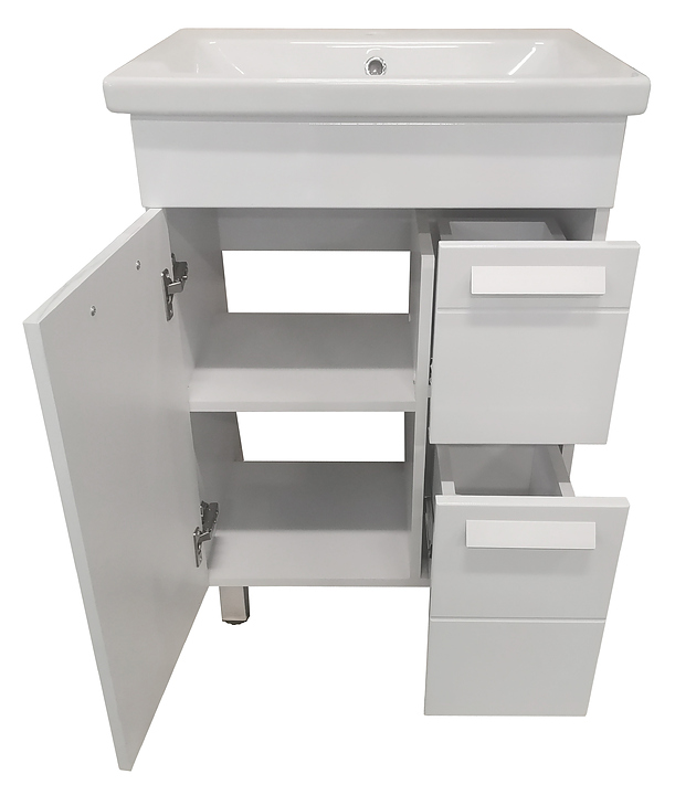Тумба Corozo Денвер 50 Z2 SD-00000530 выполнена в современном, лаконичном стиле и отлично дополнит интерьер любой ванной комнаты. Модель оснащена распашной фасад-дверцей с полкой внутри, где удобно разместить все необходимые личные принадлежности и элементы декора и 2 выдвижными ящиками. Напольная конструкция обеспечивает легкий монтаж и не требует специального ремонта в помещении. Корпус выполнен из матового ЛДСП, фасады из МДФ и покрыты белой глянцевой плёнкой, что обеспечивает изделию привлекательный внешний вид, а также износостойкость и долговечность. Тумба может использоваться вместе с раковиной Cersanit COMO 60 UM-COM60/1. Особенности: