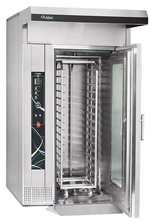Ротационный пекарский шкаф Abat РПШ-16-6-4 предназначен для приготовления хлебобулочных и кондитерских изделий, различных блюд методом обработки паром и горячим воздухом по отдельности или комбинированно на предприятиях общественного питания и торговли. Модель оснащена панелью управления с таймером, возможностью корректирования программ во время выпечки и отображения информации о режимах работы и аварийных ситуациях. В комплект поставки входит шпилька ТШГ-16-6-4 на 16 уровней. Режимы работы: