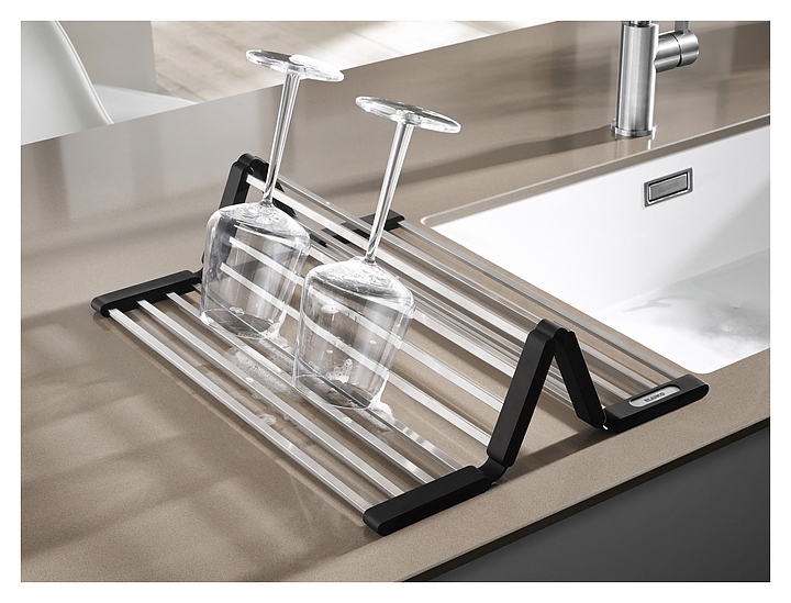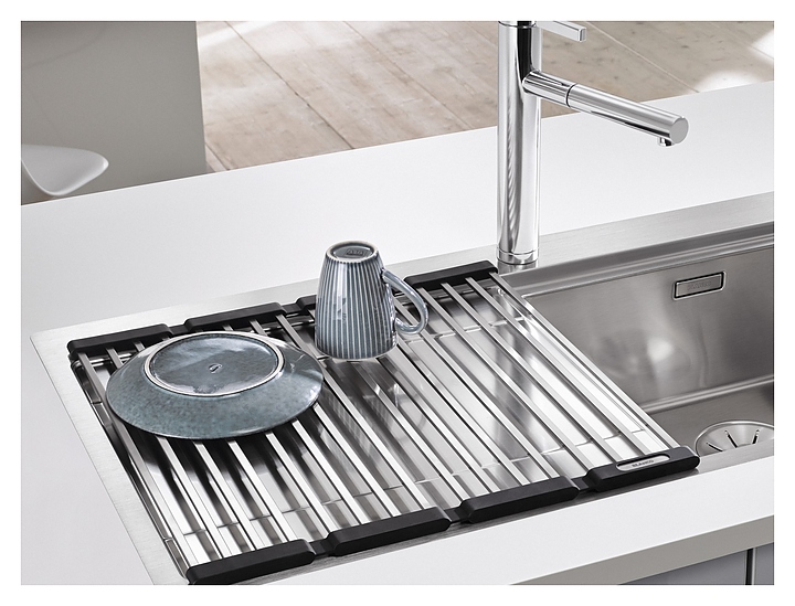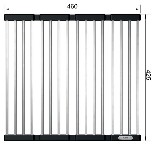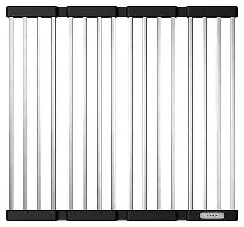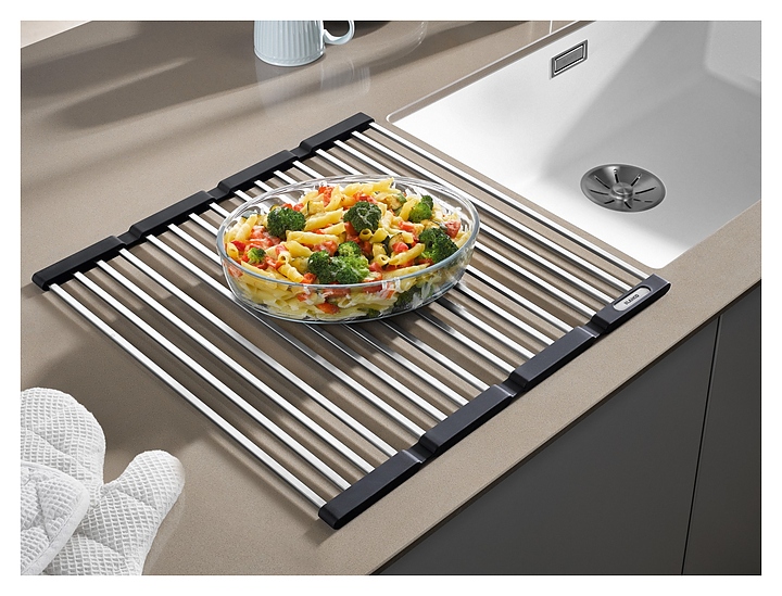 Складная решётка Blanco Klappmatte 238482 предназначена для сушки овощей, посуды и столовых приборов. Модель рекомендуется в качестве дополнительного аксессуара для любых кухонных моек Blanco серии U, подходит в качестве поддона или дополнительного места для хранения над раковиной, а также является практичным помощником на столешнице или обеденном столе. Изделие выполнено из высококачественных стержней из нержавеющей стали, которые соединены эластичными нескользящими полосками из силикона, что делает её прочной и гибкой одновременно. Особенности: