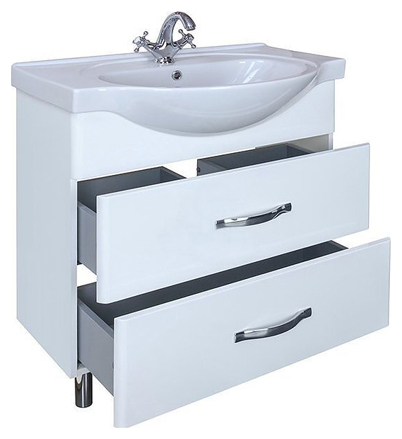 Тумба под раковину Bellezza Акона 80 дополнит интерьер ванной комнаты. Модель оснащена 2 ящиками и ножками, защищающими конструкцию в случае намокания пола. Корпус выполнен из влагостойкой ЛДСП, фасад - из МДФ. Изделие покрыто глянцевой эмалью для защиты поверхности от внешних воздействий. Тумба используется вместе с раковиной Cersanit Erica 80. Дополнительные характеристики: