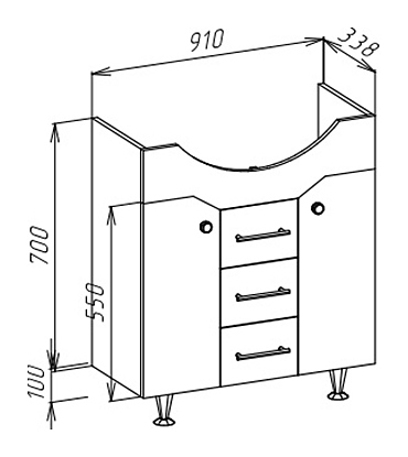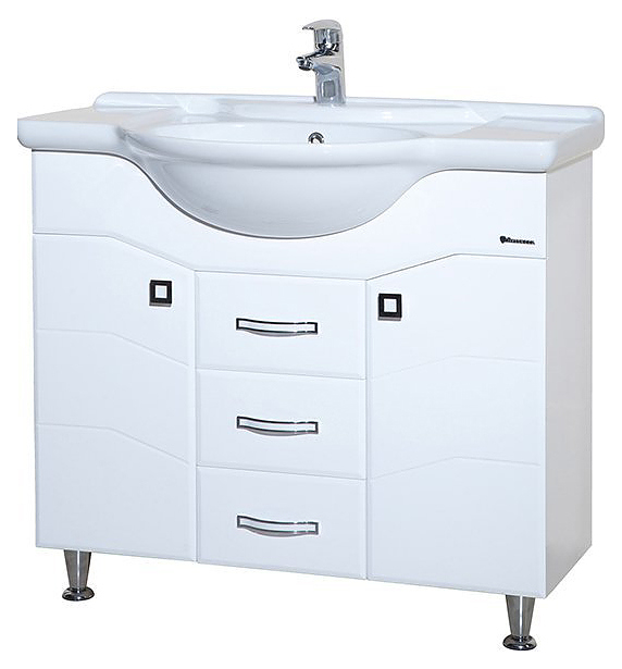 Тумба под раковину Bellezza Джулия 95 дополнит интерьер ванной комнаты. Тумба оснащена 2 распашными дверцами, 3 ящиками и ножками, защищающими конструкцию в случае намокания пола. Корпус выполнен из влагостойкой ЛДСП, фасад - из МДФ. Изделие покрыто глянцевой эмалью для защиты поверхности от внешних воздействий. Тумба используется вместе с раковинами KIROVIT Элеганс 95 и Dreja Дрея 95. В комплект поставки входят доводчики. Дополнительные характеристики:
