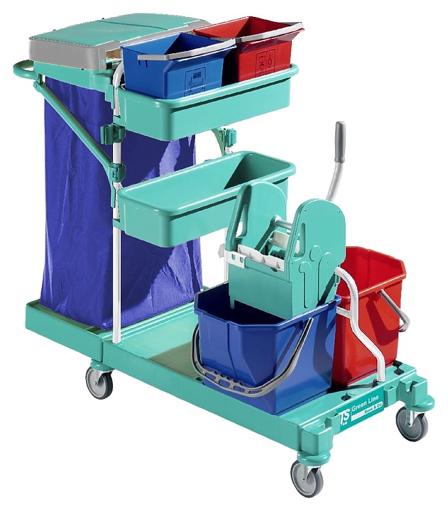 Многофункциональная уборочная тележка TTS Green 30 предназначена для сбора мусора и профессиональной влажной уборки в офисах, торговых центрах, гостиницах, на предприятиях общественного питания и других местах массового пребывания малой и средней площадей. Модель оснащена широкой платформой на 4 колесах. Платформы, корпус отжима, держатели, контейнеры и ведра выполнены из ударопрочного полипропилена, стойки – из стали с антикоррозийным полиамидным покрытием (Rilsan), рукоятка отжима – из алюминия с пластиковой накладкой. Крышка и мешок для мусора не входят в комплект поставки и приобретаются отдельно. Комплектация: