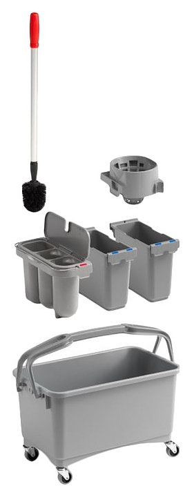 Уборочная тележка TTS Eroy E-01 предназначена для профессиональной обработки санитарных узлов в офисах, торговых центрах, гостиницах, на предприятиях общественного питания и других местах массового пребывания малой площади. Модель оснащена прямоугольной емкостью с двойной ручкой. Емкость, контейнер, ведро и отжим выполнены из прочного полипропилена, рукоятка ершика – из алюминия с пластиковой накладкой. Комплектация: