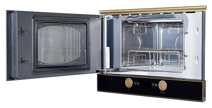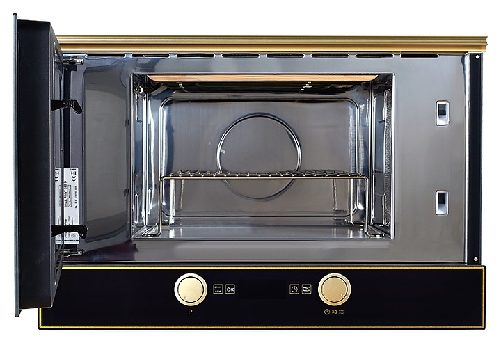 Микроволновая печь Kuppersberg RMW 393 B предназначена для приготовления пищи, подогрева готовых блюд и ингридиентов, а также размораживания полуфабрикатов на предприятиях общественного питания и в домашних условиях. Модель оснащена кабелем питания с вилкой, дверью с овальным смотровым окном, панелью управления с 2 поворотными регуляторами, сенсорными кнопками и цифровым дисплеем. Корпус выполнен из высококачественной стали с полным остеклением фронтальных панелей без винтового крепежа, внутренняя облицовка камеры – из нержавеющей стали с керамическим дном. В комплект поставки входит решетка для гриля. Особенности: