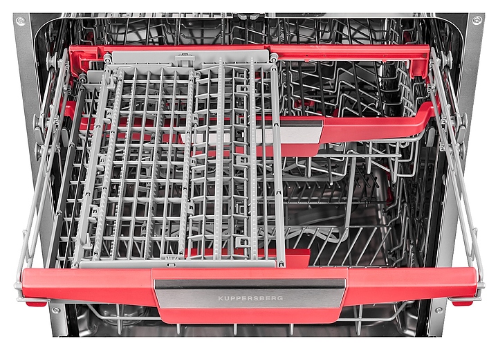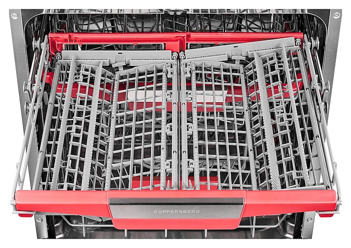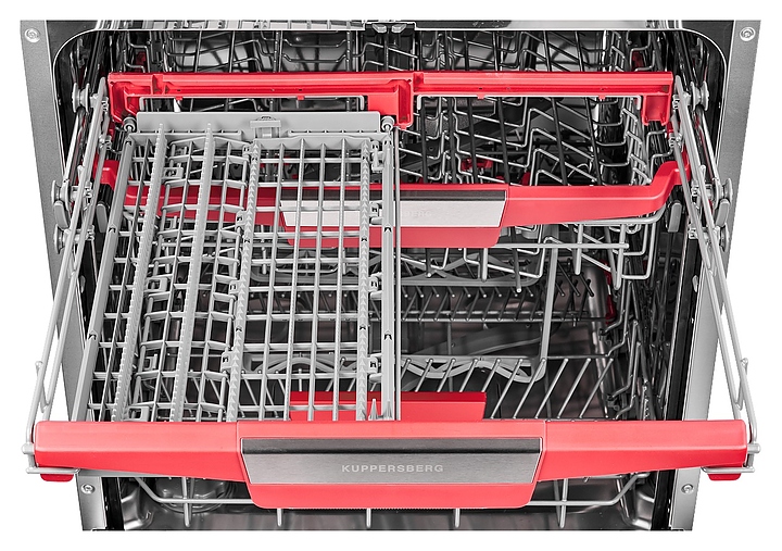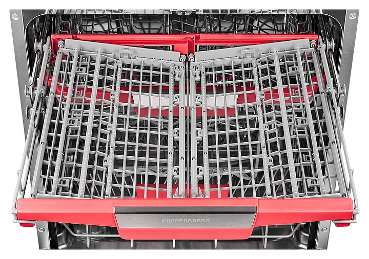 В комплект поставки входят 3 решетчатые корзины: нижняя для крупногабаритной посуды, верхняя для легкой и хрупкой посуды и лоток для раздельной загрузки столовых приборов.