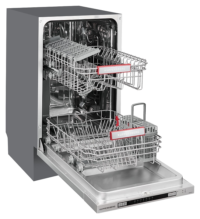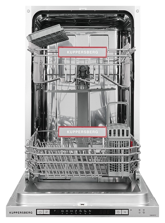 Посудомоечная машина Kuppersberg GSM 4572 предназначена для гигиенической обработки и последующей сушки различной посуды на предприятиях общественного питания, в гостиничных комплексах и домашних условиях. Модель оснащена расположенным снизу разбрызгивателями, узлом фильтров, дозатором моющих и ополаскивающих средств, резервуаром для соли, кабелем питания с вилкой, герметичной дверью и кнопочной панелью управления с цифровым дисплеем. Корпус выполнен из стали с антикоррозийным покрытием, внутренняя облицовка и компоненты камеры – из высококачественной нержавеющей стали и экологически безопасного термостойкого пластика. В комплект поставки входят 3 решетчатые корзины: нижняя для крупногабаритной посуды, верхняя для легкой и хрупкой посуды и полка-держатель для столовых приборов. Особенности: