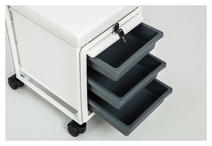 Педикюрная тележка SunDream QB0004 используется в косметологических центрах, салонах красоты и домашних студиях ногтевого сервиса для размещения инструментов, аппаратов, средств и прочих аксессуаров, рационализации рабочего пространства и создания комфортных условий для мастера и клиента. Модель оснащена 3 ящиками, 4 колесами с мягким ходом и замком для запирания секции с ящиками. Каркас выполнен из металла, ящики - из пластика, обивка - из качественной экокожи. Особенности: