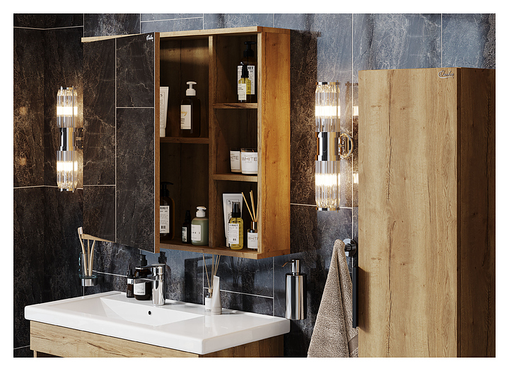 Зеркальный шкаф Onika ЛЕГРАН 80.00 от российского бренда дополнит интерьер ванной комнаты. Благодаря подвесной конструкции модель не занимает много места, что позволяет экономить пространство, а также облегчает уборку. Изделие оснащено распашной дверью, полкой за дверью и открытыми полочками в боковой части. Изделие выполнено из ЛДСП, устойчивой к механическим воздействиям, перепадам температур и высокой влажности. В комплект поставки входят подвесы для крепления. Особенности: