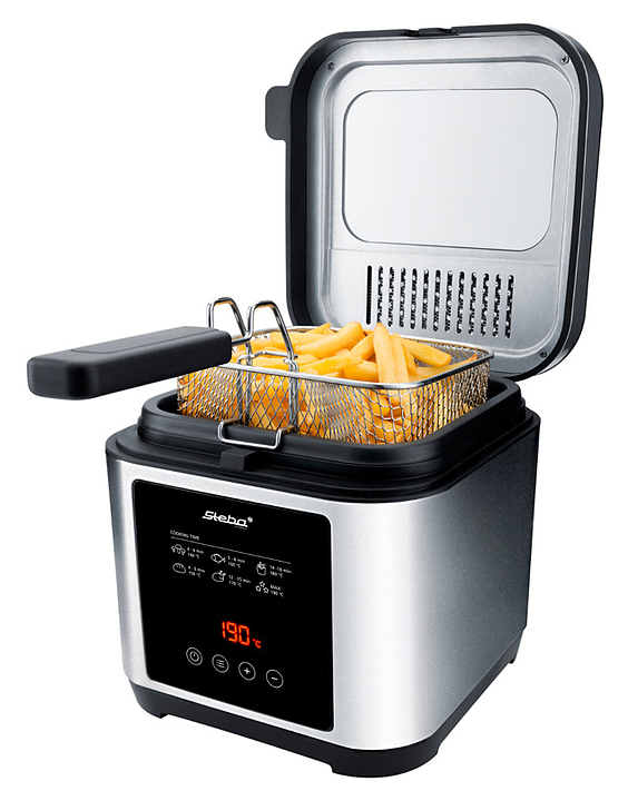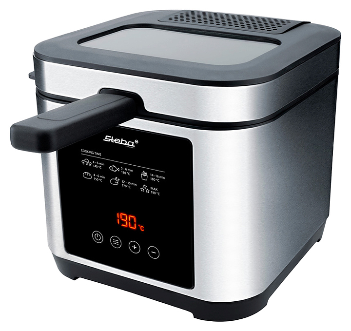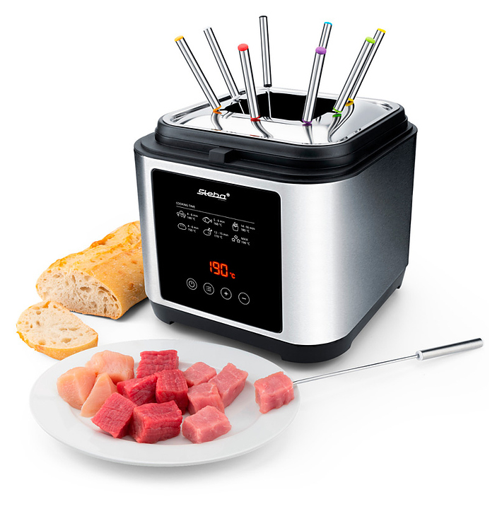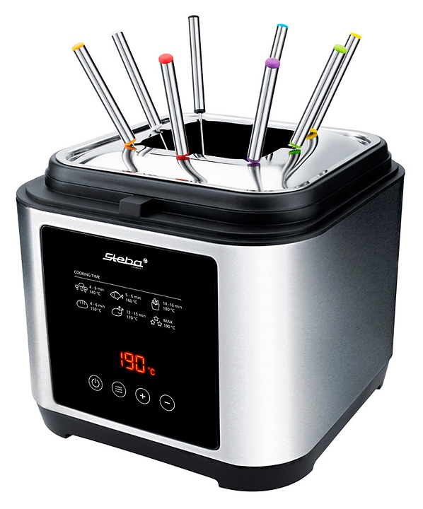 Фритюрница-фондю Steba DF 150 F предназначена для приготовления различных продуктов в большом количестве горячего масла или жира и фондю в частных домах и квартирах. Модель оснащена панелью управления с цифровым дисплеем и съемной крышкой со смотровым окном и постоянным фильтром. Корпус выполнен из нержавеющей стали. В комплект поставки входят 8 вилок из нержавеющей стали с цветной маркировкой и кольцо для фондю. Особенности: