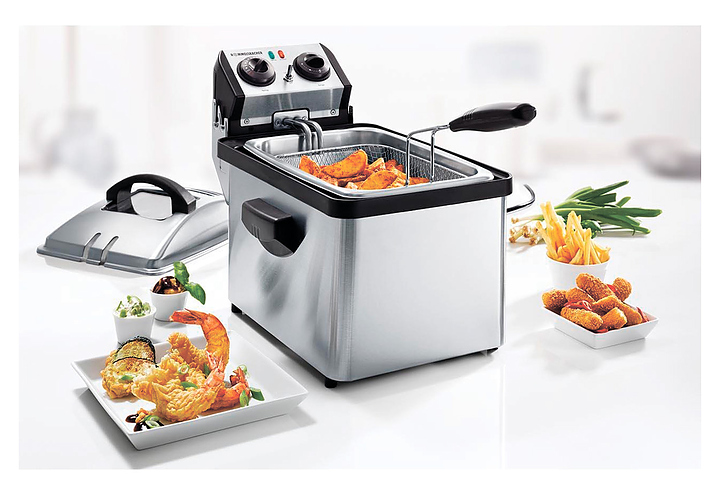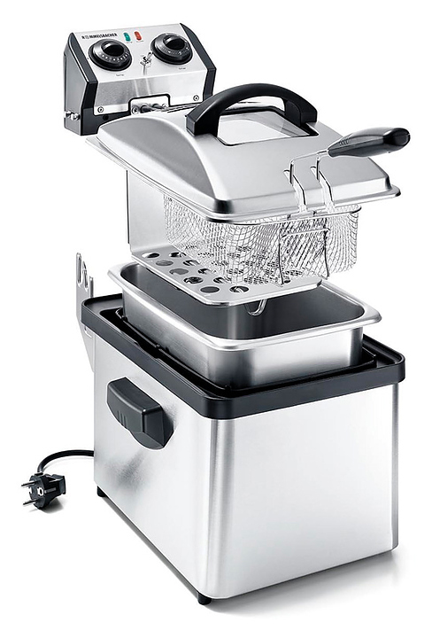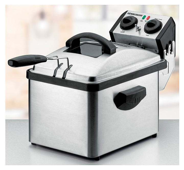 Фритюрница Rommelsbacher FRP 2135/E предназначена для приготовления различных продуктов в большом количестве горячего масла или жира в частных домах и квартирах. Модель оснащена панелью управления с 2 контрольными лампами питания и нагрева, съемным резервуаром для масла, большой корзиной для жарки и крышкой со смотровым окном и постоянным фильтром против запаха и дыма. Корпус, крышка и резервуар для масла выполнены из нержавеющей стали. Особенности: