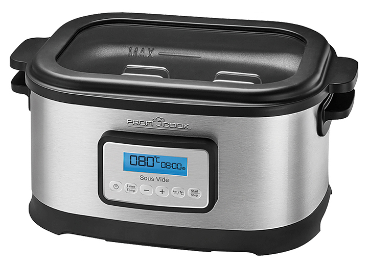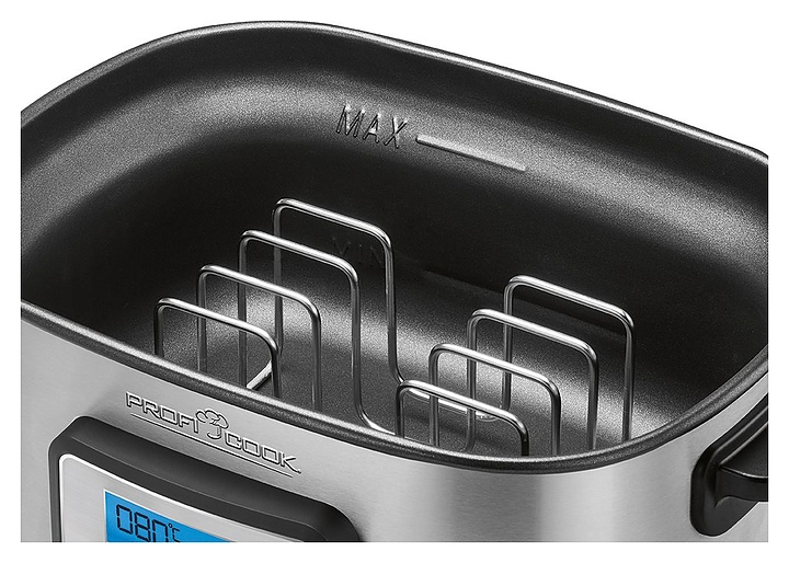 Аппарат Sous Vide Profi Cook PC-SV 1112 используется в частных домах и квартирах для приготовления пищи в герметичных пакетах в горячей воде при невысоких температурах, что позволяет сохранить в продуктах все питательные вещества, витамины и минералы и обеспечить насыщенный вкус мяса и овощей. Модель оснащена панелью управления с ЖК-дисплеем и крышкой со смотровым окном. Корпус выполнен из нержавеющей стали, варочная емкость - с антипригарным покрытием. В комплект поставки входят щипцы и держатель из нержавеющей стали. Особенности: