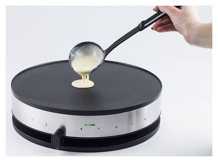 Блинница CASO CM 1300 предназначена для выпечки круглых блинов в частных домах и квартирах. Модель оснащена ползунковым регулятором температуры и световым индикатором нагрева. Корпус выполнен из нержавеющей стали, рабочая поверхность - с антипригарным покрытием ILAG. В комплект поставки входят распределитель для теста и лопатка из дерева. Особенности: