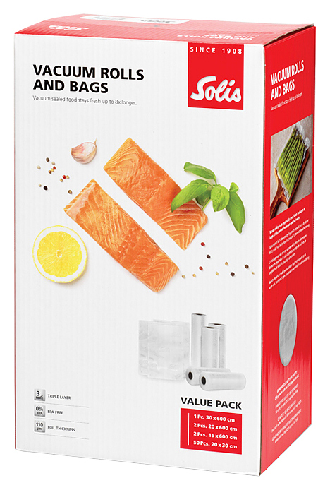 Набор рулонов и пакетов для вакуумирования Solis Value Pack используются совместно с бескамерными упаковщиками для упаковки продуктов в частных домах и квартирах для последующего их хранения или приготовления по технологии Sous Vide. Изделия выполнены из материалов, не содержащих бисфенол А. Комплектация: