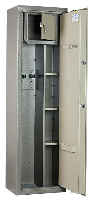 Оружейный сейф Valberg ЗАСЛОН предназначен для безопасного хранения длинноствольного огнестрельного оружия, патронов и аксессуаров в гостиницах, отелях, частных домах и квартирах. Модель оснащена распашной двухкомпонентной дверью и внутренним патронным трейзером с самостоятельной запираемой на ключ дверцей. Корпус выполнен из высококачественной стали с износостойким порошковым покрытием в светлых тонах коричневого цвета с эффектом молотковой эмали. В комплект поставки входят ключи. Особенности: