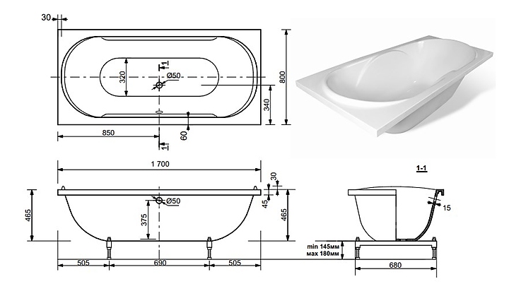 Ванна ЭСТЕТ Астра 170 ФР-00000620 170х80 мм