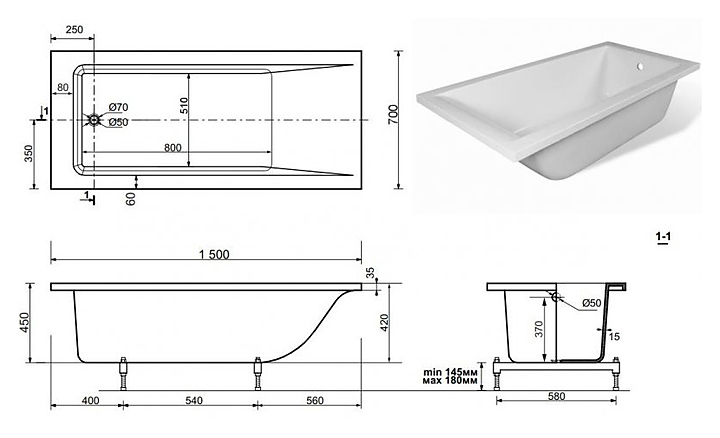 Ванна ЭСТЕТ Дельта 150А ФР-00001470 150х70 мм
