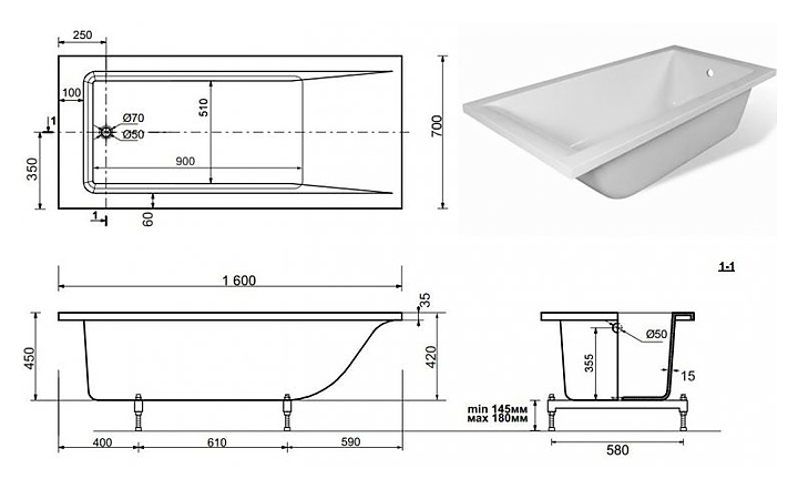 Ванна ЭСТЕТ Дельта 160А ФР-00001221 160х70 мм