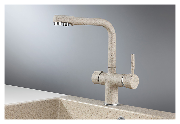 Смеситель Granula GR-2088 предназначен для использования на кухне для подачи горячей и холодной воды. Модель оснащена совмещенным изливом для проточной и фильтрованной воды, керамическим картриджем, обеспечивающим плавный ход рычага смесителя, контроль и точность при выборе напора и температуры воды, а также аэратором для создания мягкой ровной струи без разбрызгивания. Изделие выполнено из высококачественной латуни, которая отличается прочностью, долговечностью и устойчивостью к перепадам температур. В комплект поставки входят гибкая подводка, переходник для подключения фильтра с пиьевой водой и комплект креплений. Особенности: