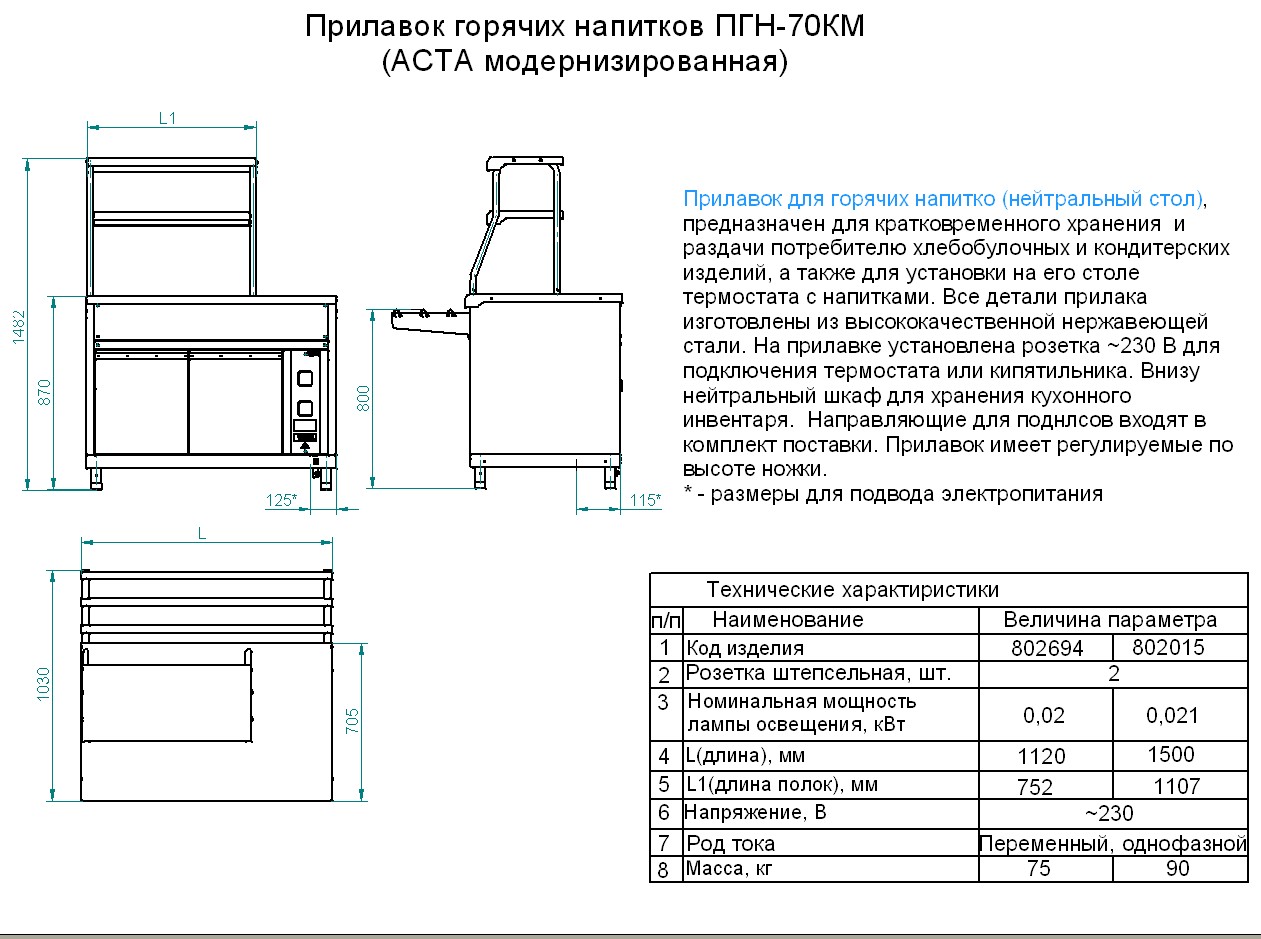 Прилавок для горячих напитков Abat ПГН-70КМ-01 предназначен для демонстрации, кратковременного хранения и последующей раздачи хлебобулочных и кондитерских изделий, термостатов с напитками в составе линий раздач на предприятиях общественного питания и торговли. Модель оснащена регулируемыми по высоте ножками. Столешница выполнена из нержавеющей стали. Особенности: