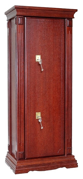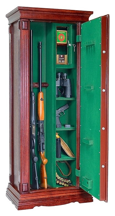 Сейф Меткон ОШ-335Эл предназначен для хранения оружия, патронов и принадлежностей. Модель оснащена 3 полками, трейзером с почтовым замком. В двери установлены 2 ключевых сувальдных замка с ригельной системой запирания в 3 стороны. Внешняя поверхность корпуса и ложементы выполнены из дерева, внутренняя поверхность - из флока. Дополнительные характеристики: