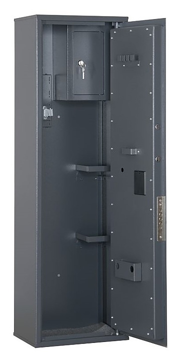 Сейф оружейный Меткон Стрелец-2СЭ предназначен для хранения оружия, патронов и принадлежностей. Модель оснащена полками, трейзером под пароны, роликовыми ложементами, ковриком и отверстиями для крепления к стене. В дверь установлены электронный кодовый и сувальдный типа «Border» замки. Дополнительные характеристики: