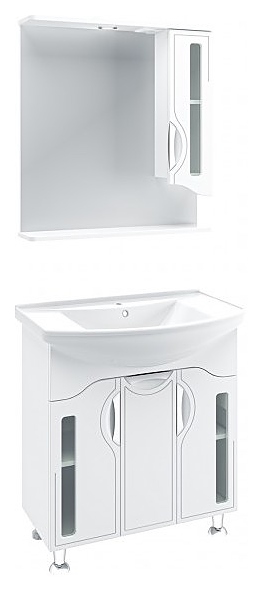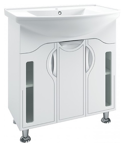 Тумба под раковину Runo Толедо 75 выполнена в современном стиле и идеально впишется в интерьер любой ванной комнаты. Модель оснащена 3 распашными дверями с оригинальной фрезеровкой и стеклянными вставками. Корпус выполнен из влагостойкой ЛДСП, фасад - из МДФ с пленкой ПВХ. Тумба используется вместе с раковиной Kirovit Стиль 75. Комплект поставки: