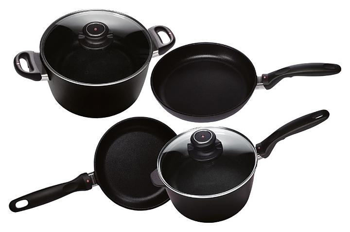 Набор наплитной посуды Swiss Diamond XD SET6006I предназначен для приготовления широкого спектра блюд на любых типах варочных поверхностей, включая индукционные, на предприятиях общественного питания и торговли, а также в домашних условиях. Корпусы выполнены из сплава алюминия и кремния методом литья под высоким давлением с последующей пескоструйной шлифовкой и плазменным напылением для усиления адгезии внешнего покрытия, рукоятки – из термостойкого бакелита, крышки – из закаленного стекла на металлическом ободе. Комплектация: