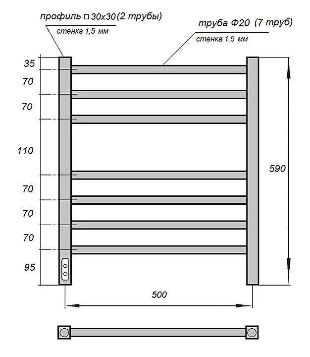 Полотенцесушитель электрический с диммером Point Веста PN70756B П7 500x600 диммер слева, чёрный