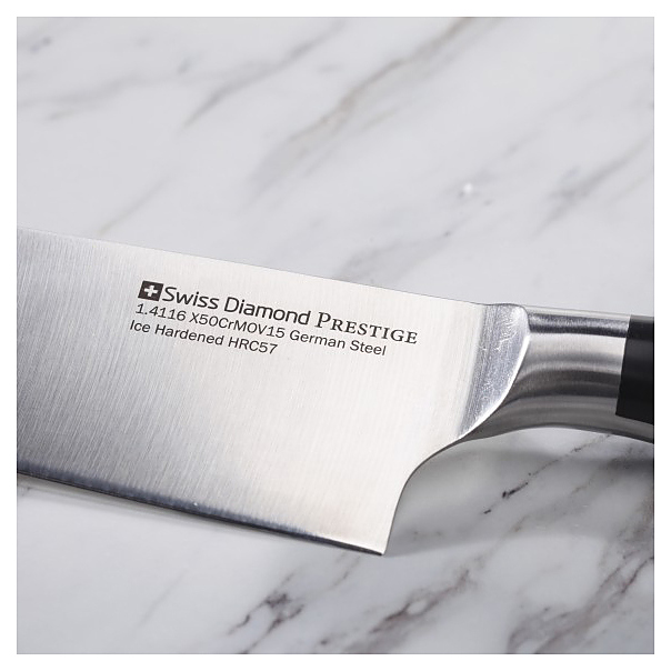 Универсальный кухонный нож Swiss Diamond SDPK05 предназначен для нарезки различных продуктов на предприятиях общественного питания и торговли, а также в домашних условиях. Модель оснащена широким острым лезвием и рукояткой с удобным захватом. Лезвие выполнено из молибден-ванадиевой стали 1.4116 (X50 Cr Mo V 15) с технологией низкотемпературной закалки, рукоятка – из ацетальной смолы (полиоксиметилен), больстер – из нержавеющей стали. Особенности: