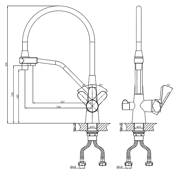 Смеситель D&K Rhein Marx DA1391901 предназначен для использования в кухонных помещениях для подачи горячей и холодной воды. Модель оснащена совмещенным гибким изливом для питьевой и проточной воды, керамическим картриджем, обеспечивающим плавный ход рычага смесителя, контроль и точность при выборе напора и температуры воды, а также аэратором для создания мягкой ровной струи без разбрызгивания. Изделие выполнено из высококачественной латуни, отличающейся прочностью, долговечностью и устойчивостью к перепадам температур. В комплект поставки входят cмеситель, гибкая подводка, комплект переходников и крепежная гайка. Особенности: