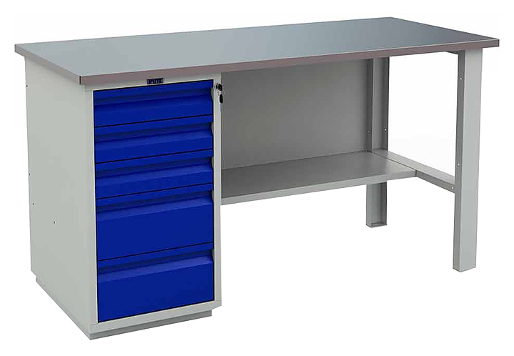 Слесарный верстак ПРОМЕТ Profi (№601) WT160.WD5/F1.000 предназначен для оснащения рабочих мест на производственных участках, станциях технического обслуживания, участках сборки и комплектации, в загородных домах и технических помещениях. Модель оснащена полкой и тумбой с 5 ящиками. Столешница изготовлена из МДФ и покрыта оцинкованным листовым металлом, корпус и тумба - из металла. Комплектация: