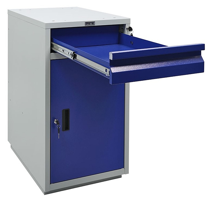 Инструментальная тумба ПРОМЕТ WD-2 предназначена для хранения универсального инструмента и оперативного передвижения его на различные участки работы на производственных участках, станциях технического обслуживания, в мастерских и гаражах. Модель оснащена съемной регулируемой полкой, выдвижным ящиком, дверью с возможностью смены стороны открывания и ключевым замком "Практик". Тумба выполнена из высококачественной стали с порошковым покрытием. Дополнительные характеристики: