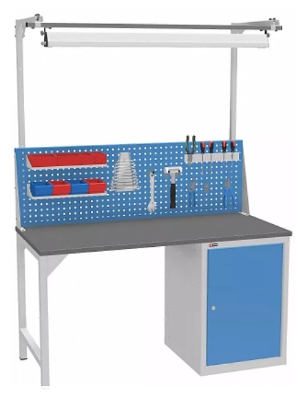 Слесарный верстак ДиКом ВЛ-К-150-07 предназначен для различных слесарных и сборочных работ в мастерских, гаражах, учебных заведениях и на производствах. Модель оснащена инструментальной тумбой с внутренними полками. Столешница изготовлена из фанеры толщиной 24 мм, покрытой оцинкованным железным листом (ЦФ). Особенности: