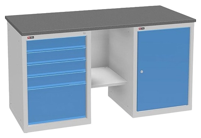 Слесарный верстак ДиКом ВЛ-К-200-08 предназначен для различных слесарных и сборочных работ в мастерских, гаражах, учебных заведениях и на производствах. Модель оснащена инструментальной тумбой с внутренними полками и тумбой с 5 выдвижным ящиками. Столешница изготовлена из фанеры толщиной 24 мм, покрытой оцинкованным железным листом (ЦФ). Особенности: