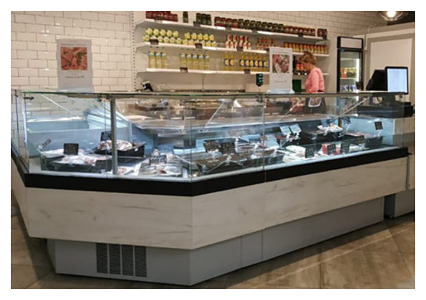 Витрина холодильная ENTECO MASTER НЕМИГА CUBE УН 90 ВС Р для рыбы на льду (выносной агрегат) угловая внешняя