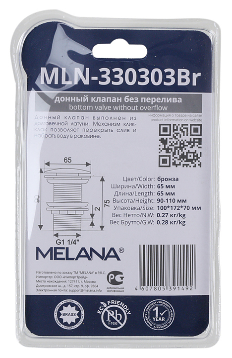 Клапан донный MELANA MLN-330303BR без перелива, бронза