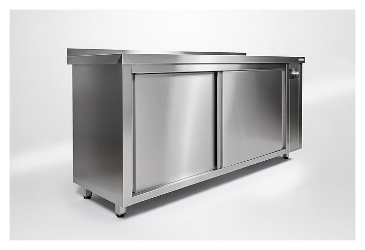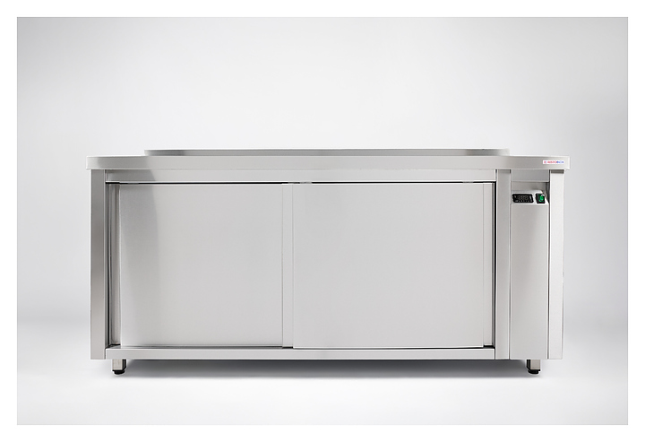 Тепловой стол Restoinox Т-СПЗК-14/6-Б используется для подогрева и хранения в подогретом виде посуды, готовых блюд и напитков перед подачей, а также в качестве рабочей поверхности для приготовления на предприятиях общественного питания и торговли. Модель оснащена расположенным сбоку нагревательным отсеком с панелью управления, обогреваемыми столешницей с задним бортом и камерой с дверьми-купе. Корпус, столешница и полка выполнены из высококачественной шлифованной нержавеющей стали AISI 430, опоры – из квадратного профиля стальной трубы AISI 430. Особенности: