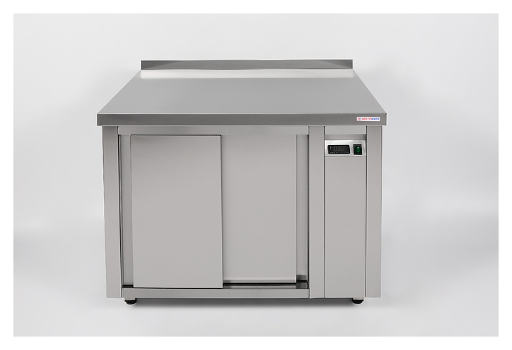 Тепловой стол Restoinox Т-СПЗК-14/7-Б используется для подогрева и хранения в подогретом виде посуды, готовых блюд и напитков перед подачей, а также в качестве рабочей поверхности для приготовления на предприятиях общественного питания и торговли. Модель оснащена расположенным сбоку нагревательным отсеком с панелью управления, обогреваемыми столешницей с задним бортом и камерой с дверьми-купе. Корпус, столешница и полка выполнены из высококачественной шлифованной нержавеющей стали AISI 430, опоры – из квадратного профиля стальной трубы AISI 430. Особенности: