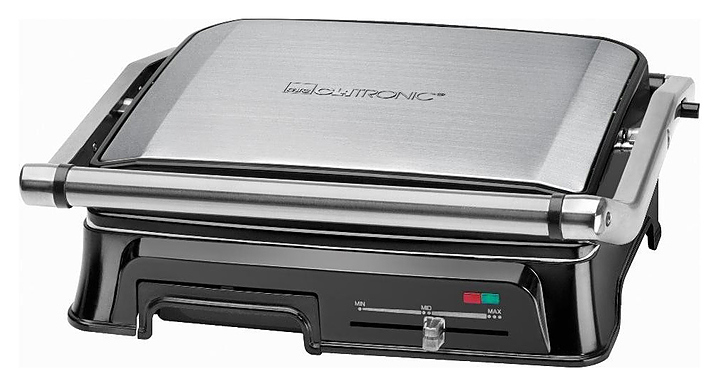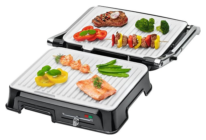 Контактный гриль Clatronic KG 3571 Keramik предназначен для жарки мяса, рыбы и овощей в частных домах, квартирах, отелях и офисах. Модель оснащена специальным дренажным каналом для стока жира, большими термоизолированными ручками, светодиодными интикаторами нагрева, питания и готовности к работе. Корпус выполнен из нержавеющей стали, покрытие пластин - из керамики. Особенности: